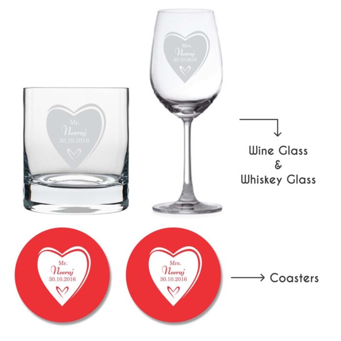 Wish the newlywed or the couple celebrating their anniversary with our personalized wedding wine glasses with Personalized Mr And Mrs Love Wine Glass & Whiskey Glass With Coasters engraved on it. A gift forever!