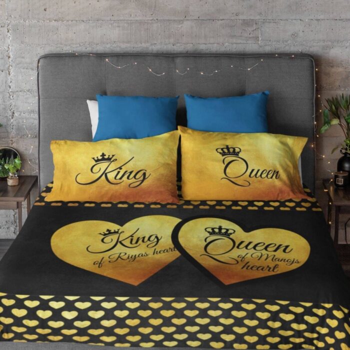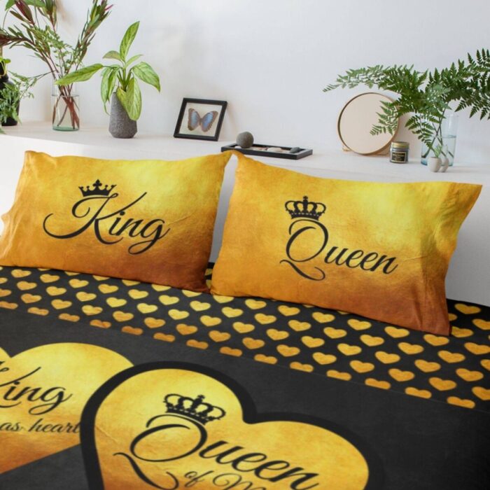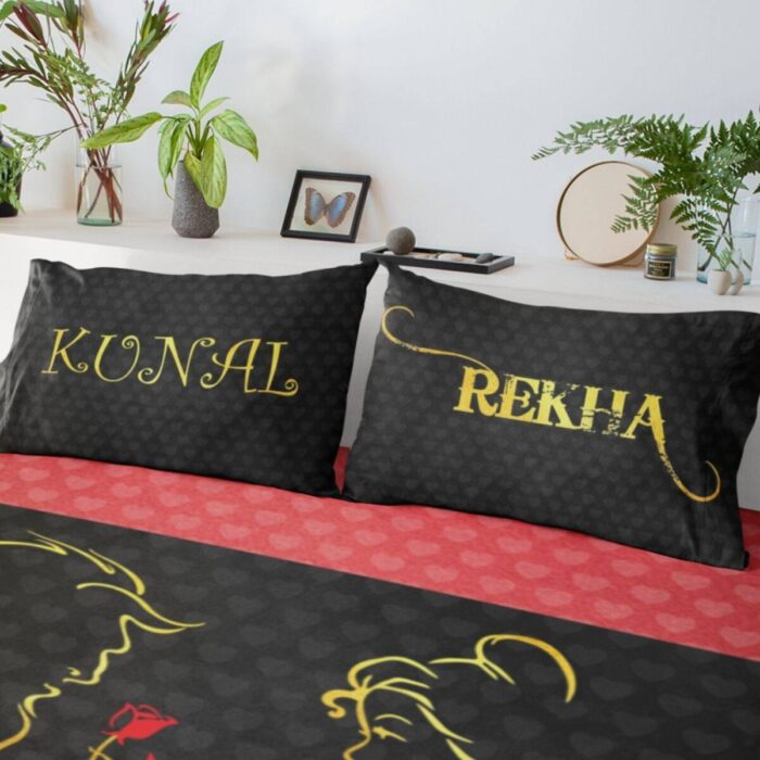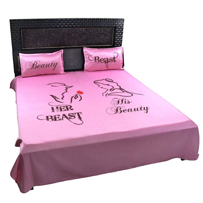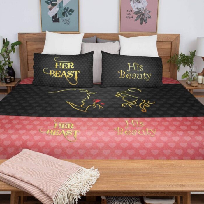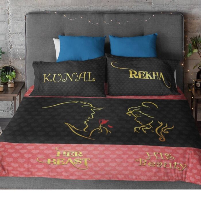 Description: This Beauty and Beast Couple bed sheet will add a personal touch to your room decor and would be a perfect Romantic couple bedsheets.