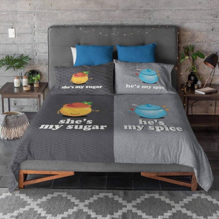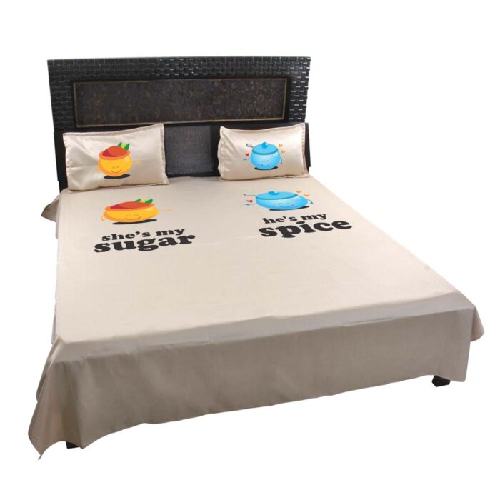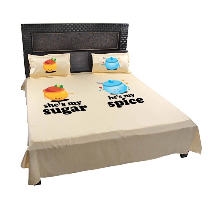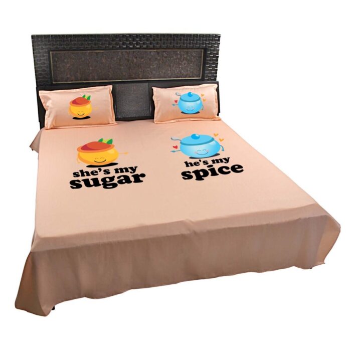 Description: This She is My Sugar He is My Spice bed sheet will add a personal touch to your room decor and would be a perfect Romantic couple bedsheets.