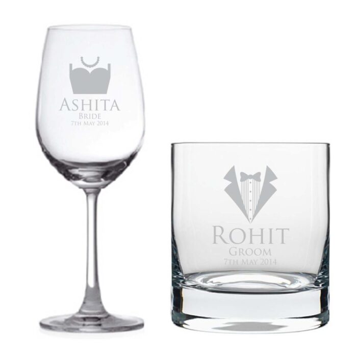 Personalized Bride And Groom Wedding Wine Glass & Whiskey Glass