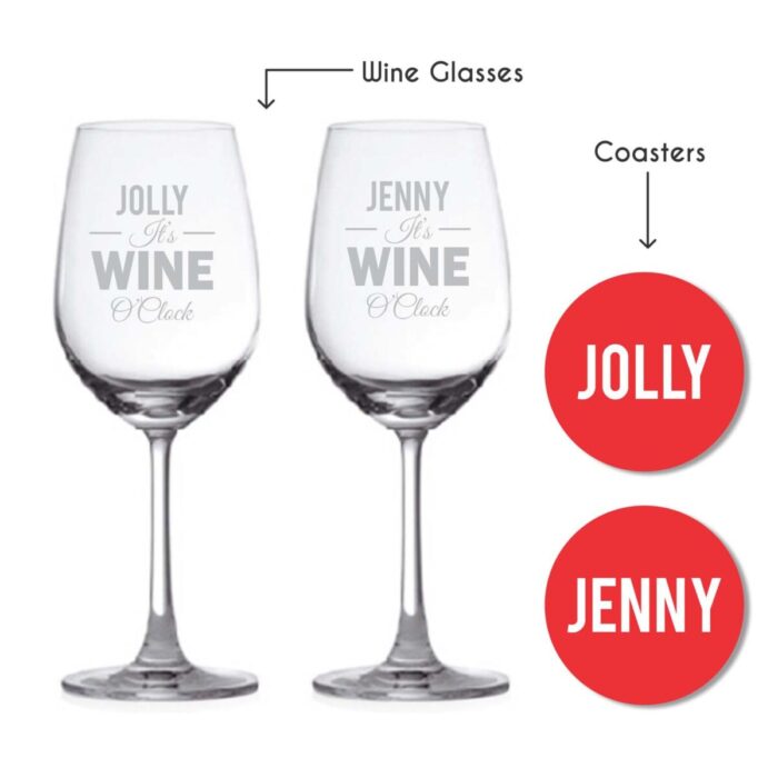 Wish your loved ones Personalized It’s Wine O Clock Wine Glass With Coasters engraved on it. A gift forever! Available in a Set of 2 with coasters this personalized White Glasses, designed to accentuate the characteristics of white vintages; they are Gracefully shaped but sturdy, and are an ideal gift for anyone with a well-stocked home bar.