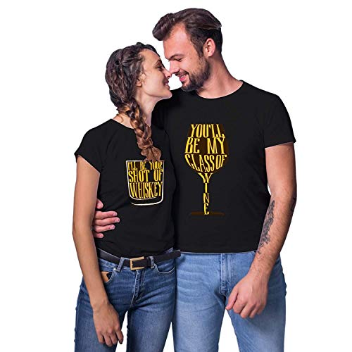 TheYaYaCafe Valentine Couple T Shirts Printed Shot of Whiskey Glass of Wine Men Women Premium Cotton Black – Men L Women L