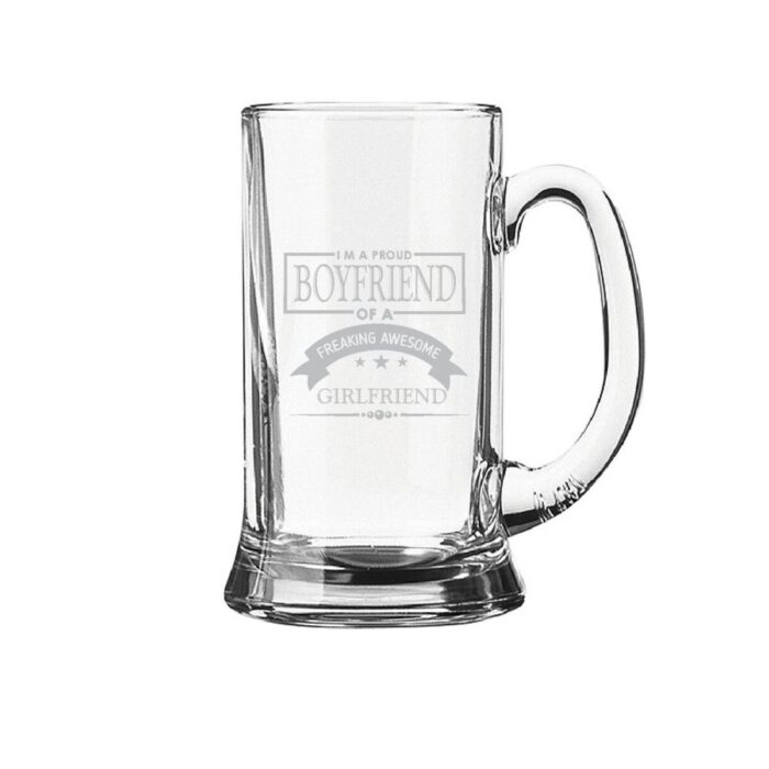 Engraved Proud Boyfriend Of Freaking Awesome Girlfriend Beer Mug with Coasters are a must-have beer gifts for those who love their beer! Classically styled Glass Beer Mug with a comfortable handle and weighty bottom, this mug holds your favorite beverage. Great for chilled beer! Gift funky engraved beer mug laser etched to create gifts that would last a lifetime!