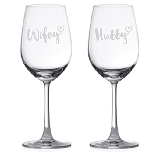 Anniversary Gifts for Couple, Hubby Wifey Engraved Wine Glass Set of 2 for Husband Wife with Coasters