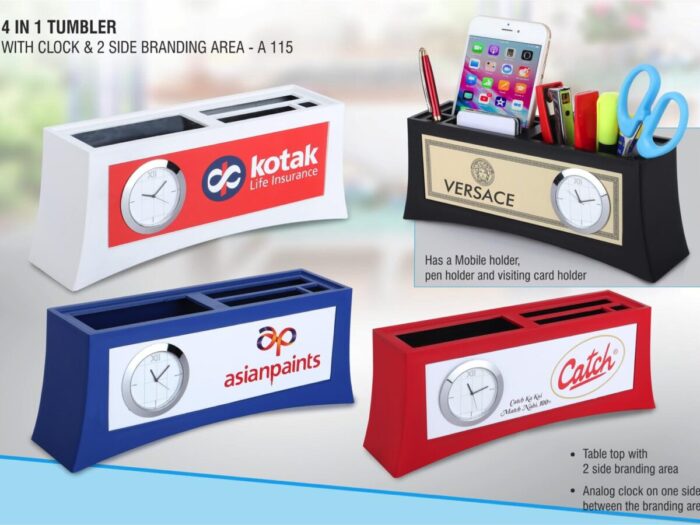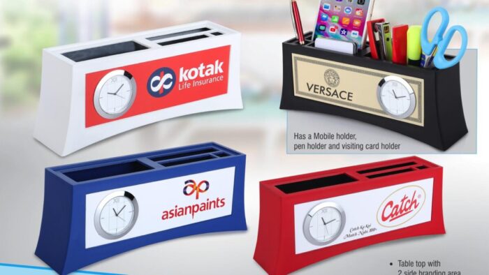 – Table top with 2 side branding area.- Has a pad holder and comes with writing pads – Has a Mobile holder, pen holder and visiting card holder – Analog clock on one side between the branding area – Artwork size: 180mm x 55mm – Clock dia: 45mm