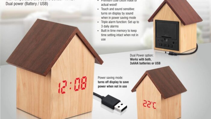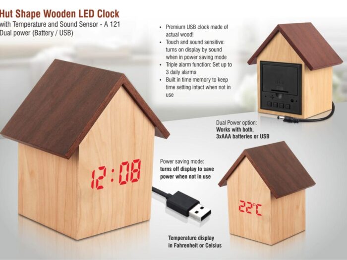 A121 – Hut shape wooden LED clock with temperature and sound…