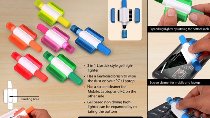 – 3 in 1 Lipstick style gel highlighter – Has a Keyboard brush to wipe the dust on your PC / Laptop – Has a screen cleaner for Mobile, Laptop and PC on the other side – Gel based non drying highlighter can be expanded by rotating the bottom – Available in 6 colors: Green, Blue, Yellow, Pink…